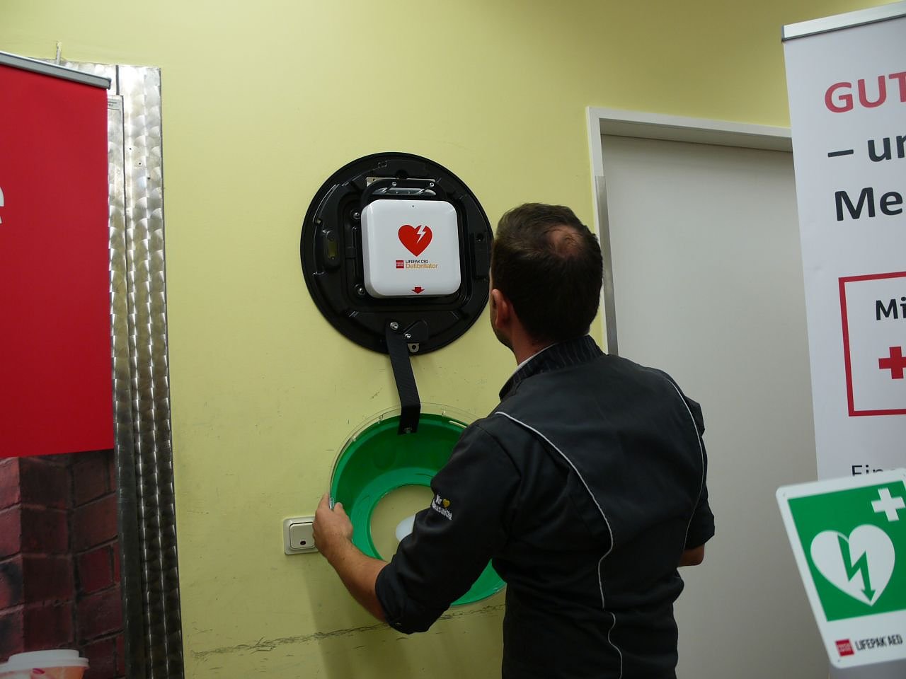Christian Schneider hatte sofort zugesagt, als die Anfrage vom DRK kam, ob im Markt solch ein Lebensretter angebracht werden kann. Gemeinsam mit dem Stellvertretenden Vorstandsvorsitzenden der Kreissparkasse, Frank Sondermann, weiteren Vertretern der Kreissparkasse und dem Vorstand des DRK-Kreisverbandes sowie dessen Präsidenten Gerd Reinhardt, wurde der erste Defibrillator aus dieser Spendenaktion gestern in Betrieb genommen und die anderen vier übergeben. Das Herz mit dem Blitz zeigt, dass mit diesem Gerät schnelle Hilfe in lebensbedrohlichen Fällen geleistet werden kann.