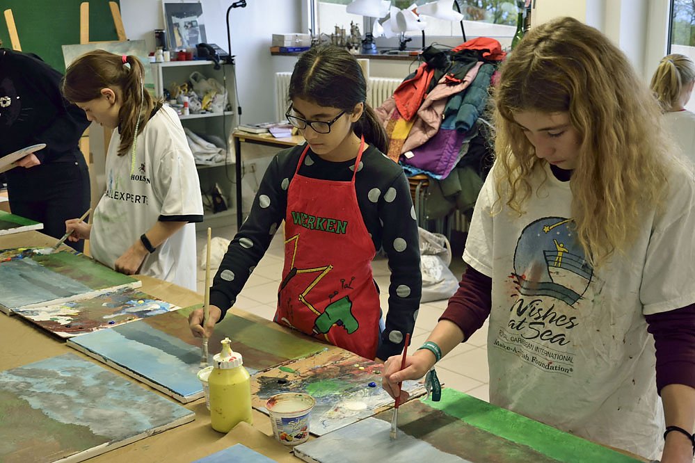 „Smila, Silva und Ronja beim Nacharbeiten ihrer Landschaftsbilder“);