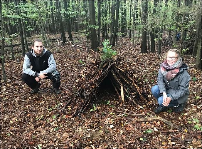 Autor: ikMattis Willenberg, Absolvent Freiwilliges Ökologisches Jahr und Lisa Schäfer, ehemalige Commerzbank-Umweltpraktikantin, beim Bau einer Laubhütte im Naturparkzentrum Fürstenhagen. Foto: Maria Trost, Naturparkverwaltung