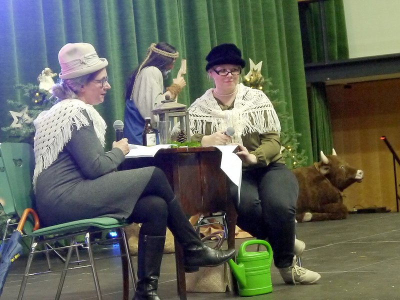 Als Hilde und Erna kamen Marianne Köhler und Ulrike Lehne von der Stadtbibliothek, die in einem Sketch die Weihnachtsvorbereitungen auf eine sehr amüsante Weise vortrugen. Das begann mit der Weihnachtsgans, führte über den sogenannten Enkeltrick zu durchlöcherten Jeans bis zum Weihnachtsmarkt in Erfurt, wo eine beschwipste Eichsfelder Seniorengruppe aufgefallen war und endete schließlich beim selbst gehäkelten Topflappen. Die Besucher hatten viel Spaß an diesem Vortrag.
