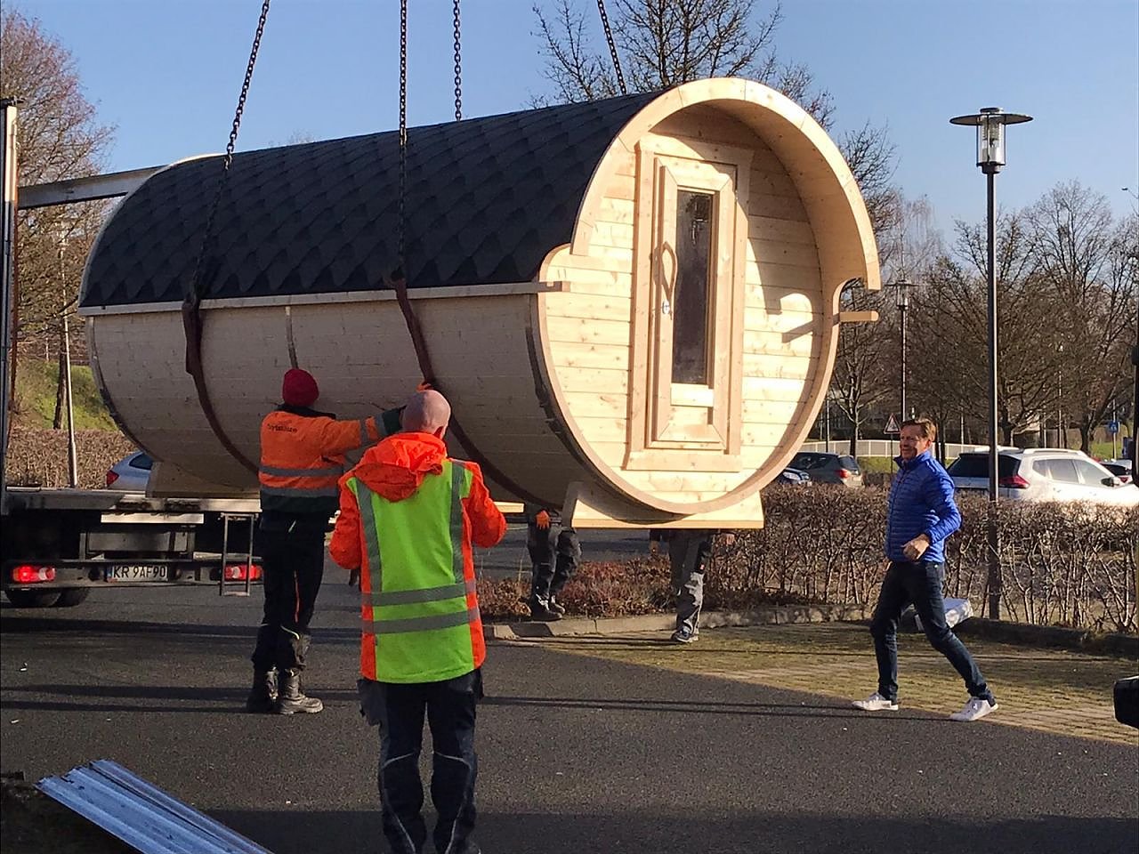 Da die Fasssauna im Ganzen und anschlussfertig geliefert wurde, musste ein riesiger Schwerlastkran die Konstruktion an ihren vorgesehenen Platz hieven.