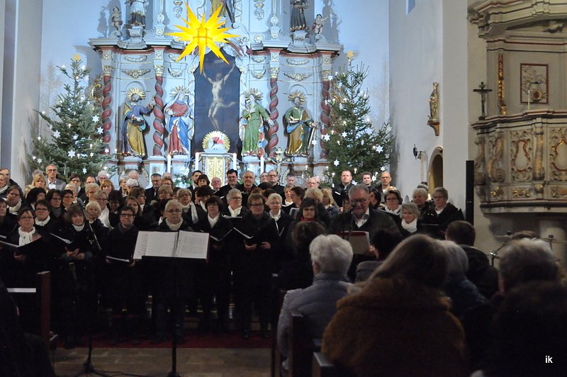 Rund 90 Sängerinnen und Sänger erfüllten die Kirche mit klassischen wie auch modernen Liedern zur Weihnachtszeit und gaben auch Hits zum Besten, die von den Konzertbesuchern gern mitgesungen wurden. Der musikalische Leiter, Pfarrer Bernhard Streicher, hatte dazu angeregt. Vor zehn Jahren hat er sich selbst einen Traum erfüllt und diesen Projektchor, der immer zur Weihnachtszeit auftritt, ins Leben gerufen. Zunächst waren es 40 sangesfreudige Mitglieder, jetzt, genau zehn Jahre später, spricht man von 100. Rund 90 waren heute beim Konzert dabei. Ein Klangkörper, der nicht zu überhören war, einschließlich seiner Solisten.