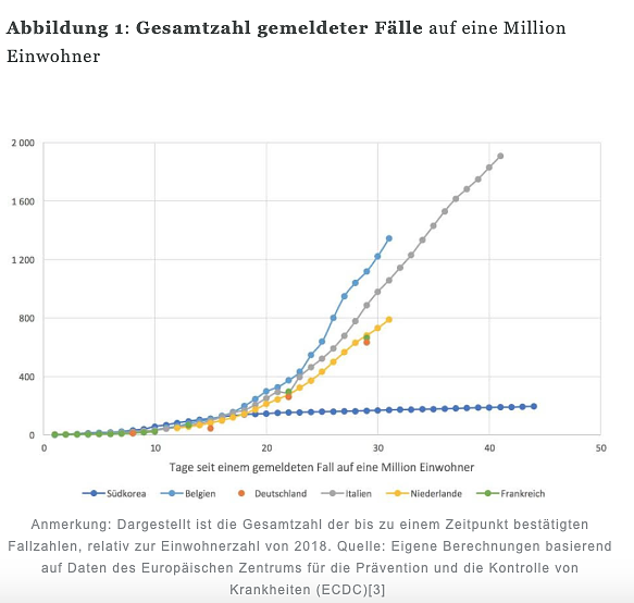 [4] Max Roser, Hannah Ritchie und Esteban Ortiz-Ospina (2020): Coronavirus Disease (COVID-19) – Statistics and Research (online verfügbar); Alexandra Hoffmann et al. (2020): Laborbasierte Surveillance SARS-CoV-2 (online verfügbar); Rijksinstituut voor Volksgezondheid en Milieu, Ministerie van Volksgezondheid, Welzijn en Sport: Virologische dagstaten (online verfügbar); Presidenza del Consiglio dei Ministri - Dipartimento della Protezione Civile: COVID-19 Italia - Monitoraggio situazione (online verfügbar); Agence nationale de santé publique (2020): COVID-19 : point épidémiologique du 5, 6, 7, 10, 15, 24 mars, 2 avril 2020 (online verfügbar); Korea Centers for Disease Control and Prevention: The updates on COVID-19 in Korea (online verfügbar); Sciensano, Epistat: Dataset of confirmed cases by date, age, sex and province (online verfügbar).