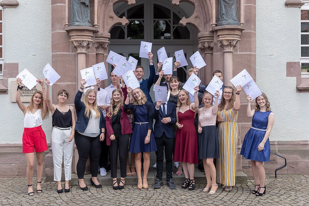 Auch die Zeugnisverleihung fand anschließend im kleinen Rahmen statt. Im Altarraum stellte sich je ein halber Kurs im Halbkreis auf und erhielt die Zeugnisse von ihren Kursleitern. Unsere Oberstufenleiterin Frau Schwanstecher gab zu, dass die Abitur- und Zeugniszeit durchaus für sie mit Stress verbunden sei. Zum Ausgleich fiele ihr dafür aber auch der schönste Teil zu: die Vergabe der Zeugnisse, Ehrungen und Preise am Ende der Prüfungszeit.
