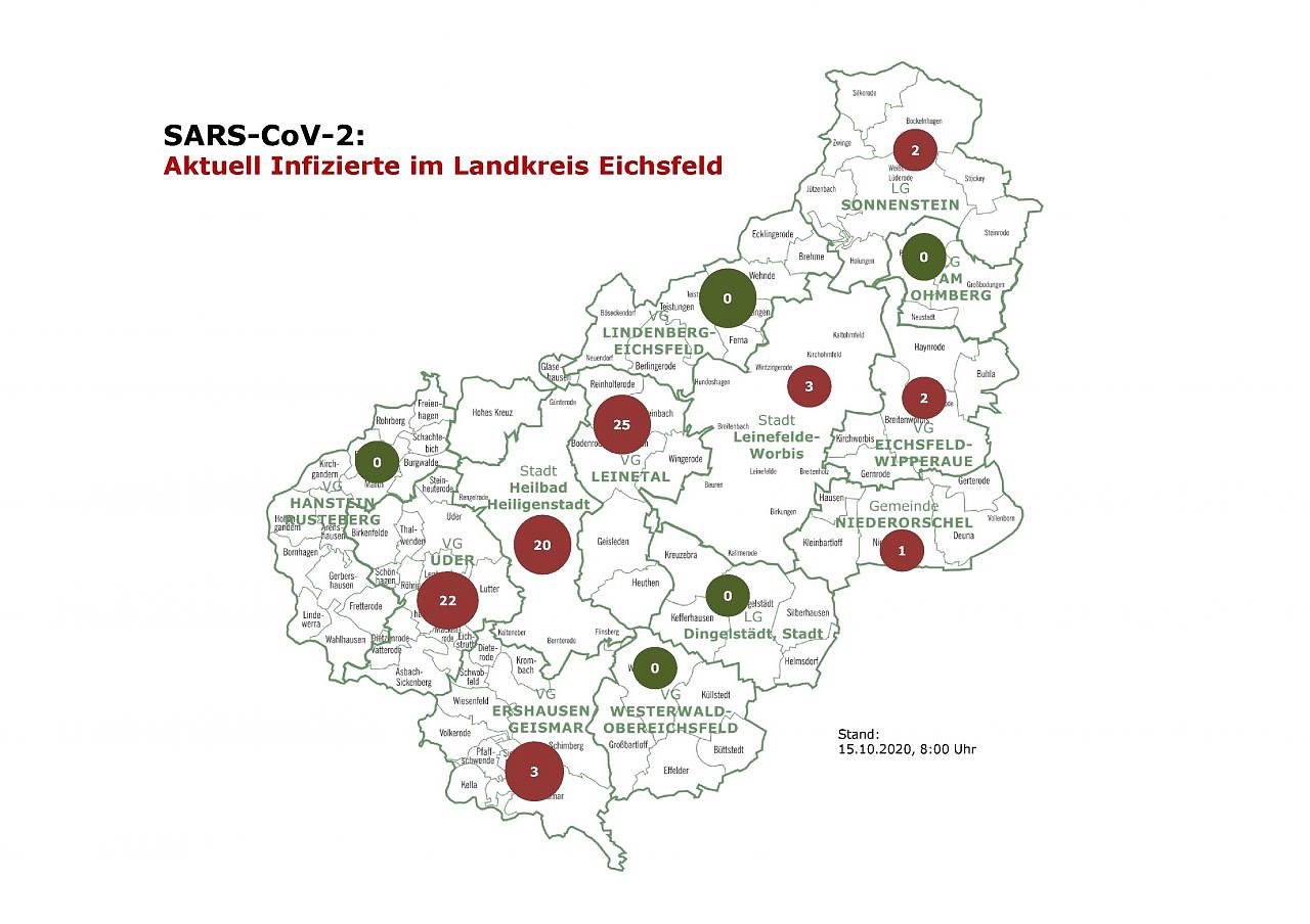 Besonders betroffen sind Uder mit 19, Heilbad Heiligenstadt mit 18, Reinholterode mit 8 und Steinbach mit 9 infizierten Personen. Alle anderen erkrankten Personen verteilen sich über das gesamte Kreisgebiet.