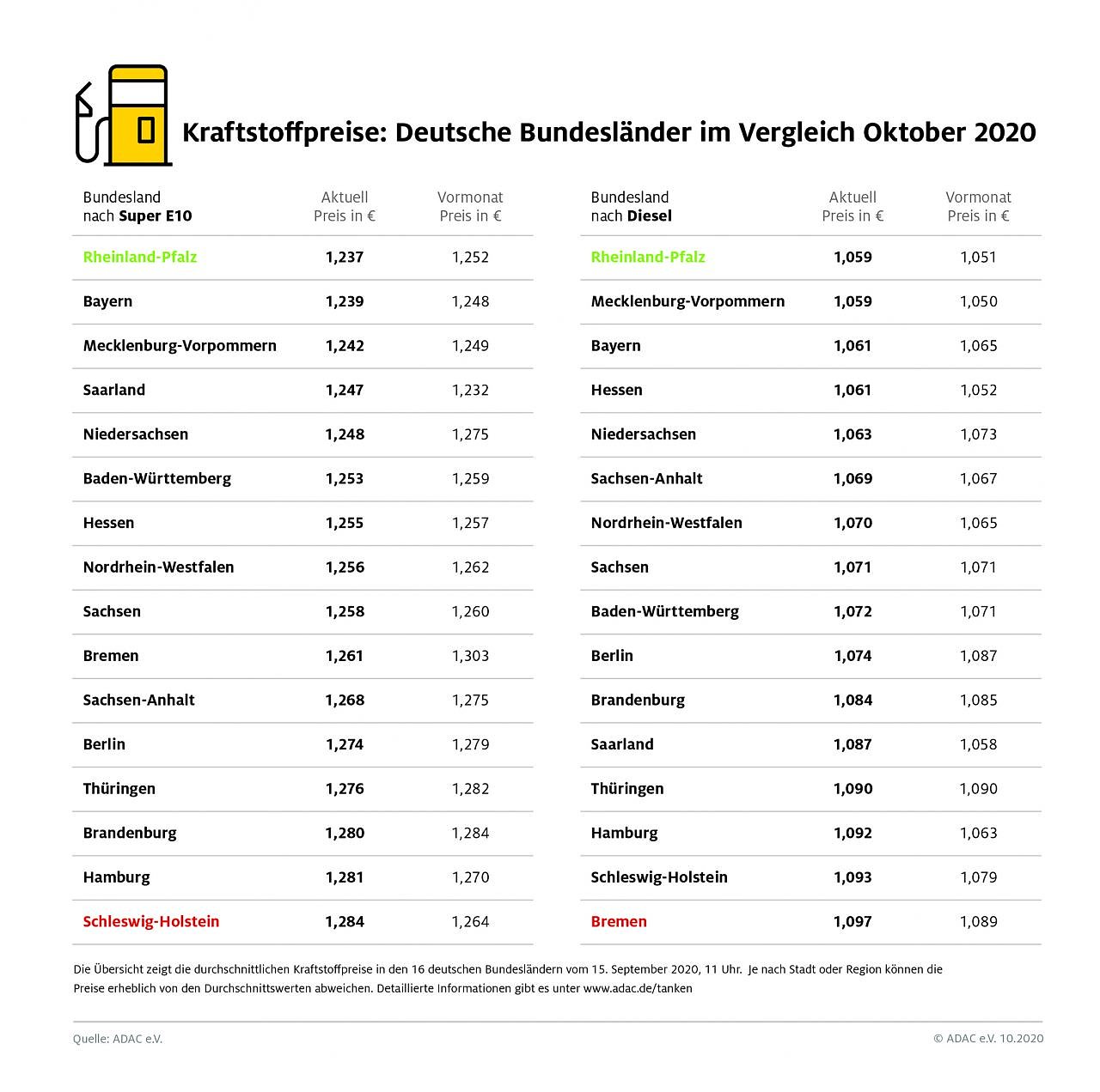 Diesel ist derzeit ebenfalls in Rheinland-Pfalz am günstigsten. Ein Liter kostet hier durchschnittlich 1,059 Euro, ebenso in Mecklenburg-Vorpommern. Bayern und Hessen folgen knapp dahinter mit einem Mittelpreis von 1,061 Euro. Verbraucher bezahlen aktuell in Bremen für Diesel mit 1,097 Euro pro Liter am meisten. Die Differenz zum günstigsten Bundesland liegt bei 3,8 Cent.