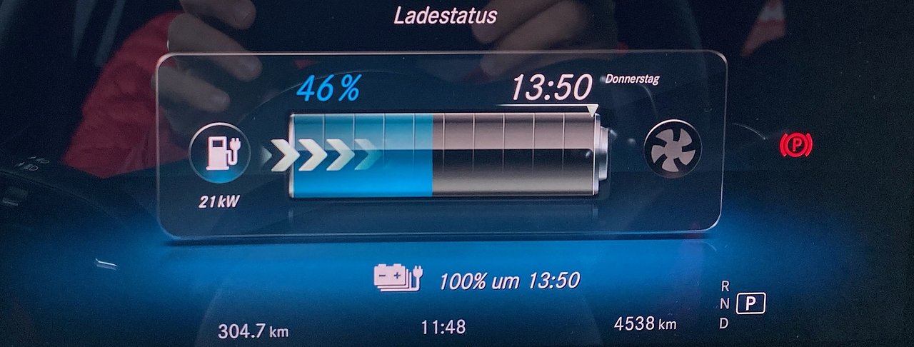 Dass die Ladesäule am Ladepark den EQC 400 nur mit 50kW maximaler Leistung erkannt hat, ist interessant. Angegeben sind seitens Mercedes 110kW Maximalleistung. Die Säule (übrigens offiziell im Testbetrieb) sortierte ihn halt niedriger ein. Ist auch bei unseren Fahrzeugen so: eines hat max. 150kW und wird dort mit 84kW erkannt, das andere kann bis zu 40kW, wird aber mit 35kW erkannt. Das könnte ein Grund sein.