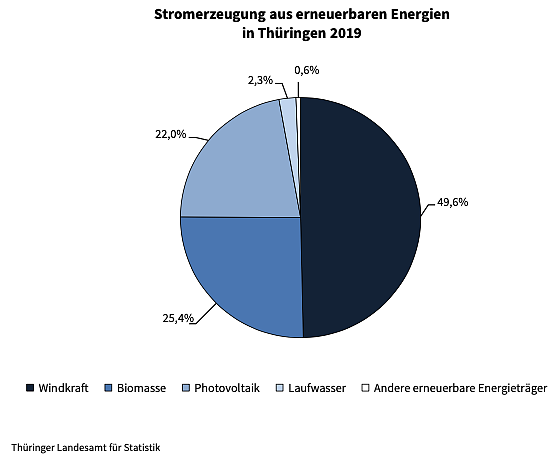 Die Stromerzeugung mittels Photovoltaik erhöhte sich um 5,4 Prozent und betrug 22,0 Prozent an der Ökostromerzeugung Thüringens im Jahr 2019.