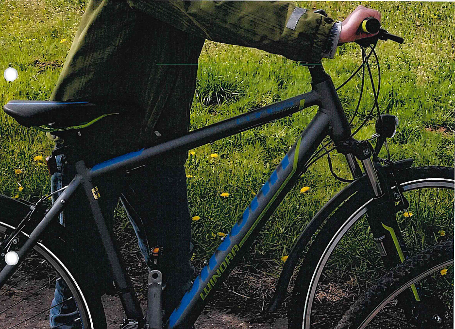 Bei dem Fahrrad handelt es sich um ein titangraues Mountainbike mit grünen Streifen der Marke "Winora", Typ "Tonga". Das Mountainbike verfügt über Beschriftung in blauem und gelbem Schriftzug und schwarze Schutzbleche. Der Sattel war mit einem Fellüberzug geschützt. Mit dem Fahrrad verschwand auch das Fahrradschloss.
