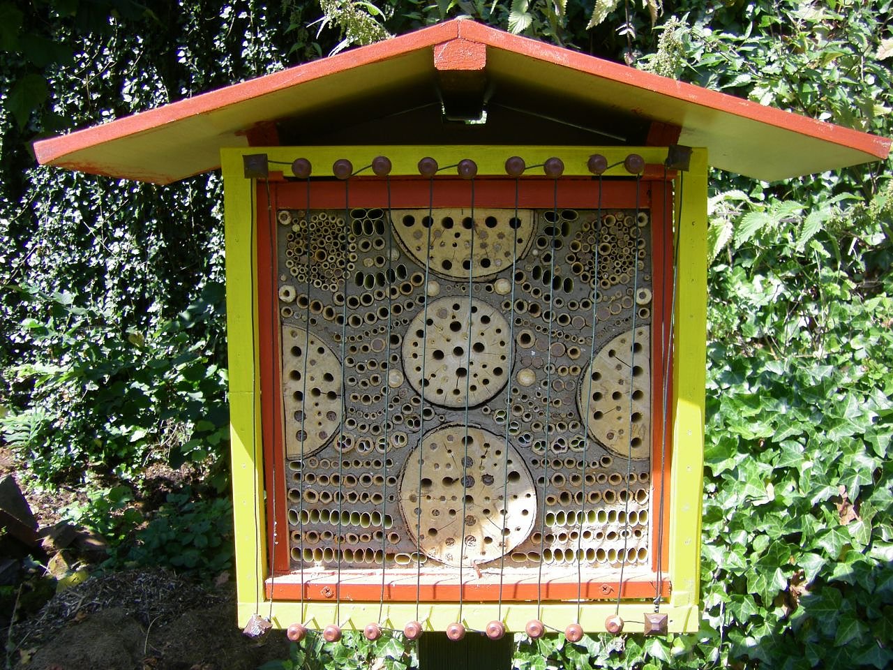 Jahrzehnte lang haben sich in Jena tausende 12 cm lange Plastikröhrchen von den Sichtschutzmatten aus dem Baumarkt bewährt! Ein breites Dach mit Steingarten bewachsen, einer wasserdichten Rückwand sowie ein Rahmen mit 3x3 cm großen Kaninchendraht schützt im Abstand von über 10 cm vor Vogelschäden. Ein sonniger Standort mit feuchter Erde erleichtert den Bienen den Ausbau ihrer mit Blütenstaub und Eiern belegten Kinderstuben.