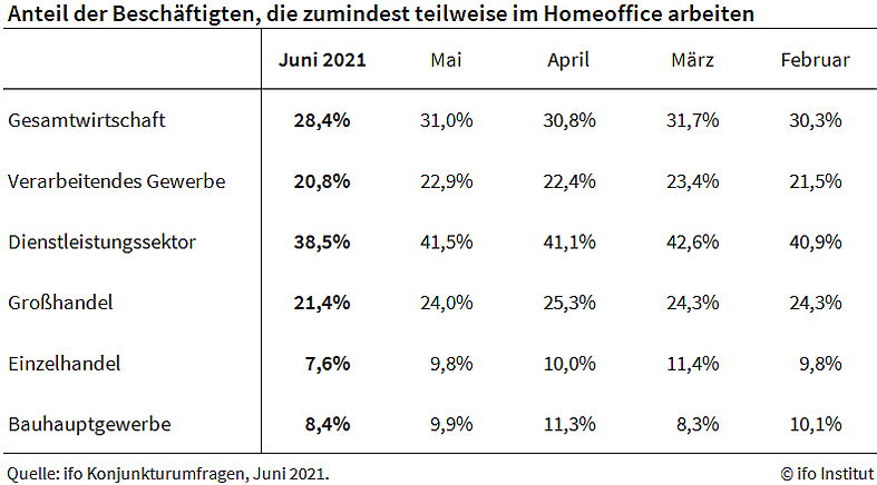 Demnach fiel der Anteil von 31,0 auf 28,4 Prozent der Beschäftigten, die zumindest teilweise im Homeoffice arbeiteten. Trotz der erst zum Ende Juni auslaufenden Pflicht zum Homeoffice ist die Entwicklung bereits leicht rückläufig, sagt Jean-Victor Alipour, Experte für Homeoffice beim ifo Institut. Mit dem abklingenden Infektionsgeschehen und der steigenden Impfquote kehren Beschäftigte in die Präsenzarbeit zurück.