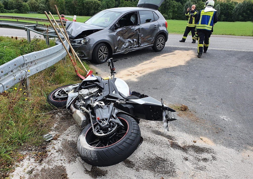 Der 48-jährige Kraftradfahrer wurde durch die Wucht des Aufpralls in einen Straßengraben geschleudert und schwer verletzt. Auch die Polofahrerin musste medizinisch versorgt werden. Die Unfallfahrzeuge waren nicht mehr fahrbereit und wurden abgeschleppt. Auch die Schutzplanke wurde beschädigt. An der Unfallstelle kam es bis 18 Uhr zu Verkehrsbehinderungen. Ein Unfallgutachter unterstützte die Polizeibeamten vor Ort bei der Unfallaufnahme.
