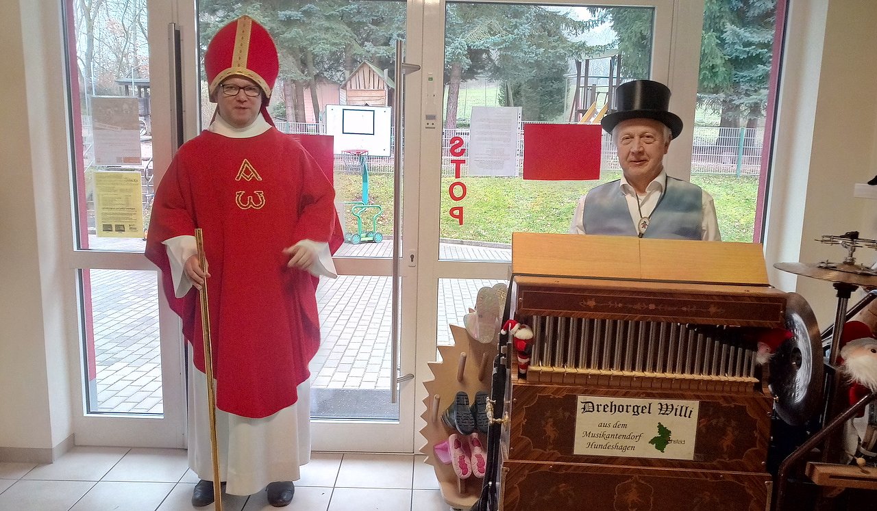 Gerade in der Coronapandemie ist es wichtig, Menschen eine Freude zu bereiten sowie Hoffnung und Wärme zu verbreiten. Wilhelm Reimann, genannt "Drehorgel-Willi", und Pfarrer Tobias Reinhold als Bischof Nikolaus brachten den Kindern und Erzieherinnen im katholischen Kindergarten "Schwester Aquina" von Hundeshagen eine adventliche Freude. Hundeshagen gilt als das Musikantendorf im Eichsfeld. Wilhelm Reimann erfreute mit Liedern wie "Lasst uns froh und munter sein"; "Wir sagen euch an, den lieben Advent", "In der Weihnachtsbäckerei" und "Kling Glöckchen" die Anwesenden und Pfarrer Reinhold überreichte den Kindern kleine Geschenke zum Nikolaustag.