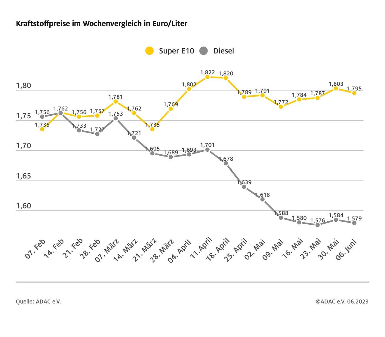 Autor: redDer Preis für einen Liter Super E10 ging um 0,8 Cent auf 1,795 Euro zurück, Diesel verbilligte sich um 0,5 Cent auf 1,579 Euro. Die Differenz der beiden Sorten bleibt mit 21,6 Cent auf stabilem Niveau.