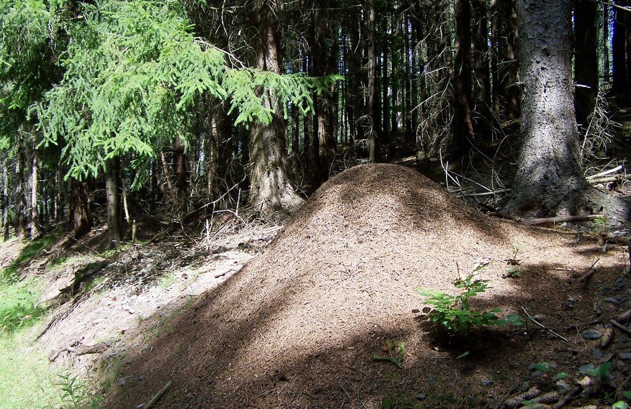 Die mit dem Sonnenlauf wandernde Beschattung von Ameisennestern ist für die Krabbler lebenswichtig. Auf Borkenkäferschadflächen fehlt den Ameisen die Fichte: Als Hitzeschutz und Nahrungsgrundlage (Foto: Dr. Horst Sproßmann) Die mit dem Sonnenlauf wandernde Beschattung von Ameisennestern ist für die Krabbler lebenswichtig. Auf Borkenkäferschadflächen fehlt den Ameisen die Fichte: Als Hitzeschutz und Nahrungsgrundlage (Foto: Dr. Horst Sproßmann)