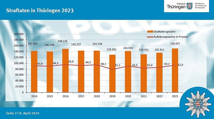 „Heute stelle ich Ihnen Zahlen vor, die es in sich haben“, sagte Innenminister Georg Maier zum Auftakt der Medienkonferenz. Was er meinte: Mit über 150.000 Straftaten gingen 2023 10,7 Prozent mehr Straftaten in die Polizeilichen Kriminalstatistik (PKS) ein als 2022. Wir haben die Einzelheiten...