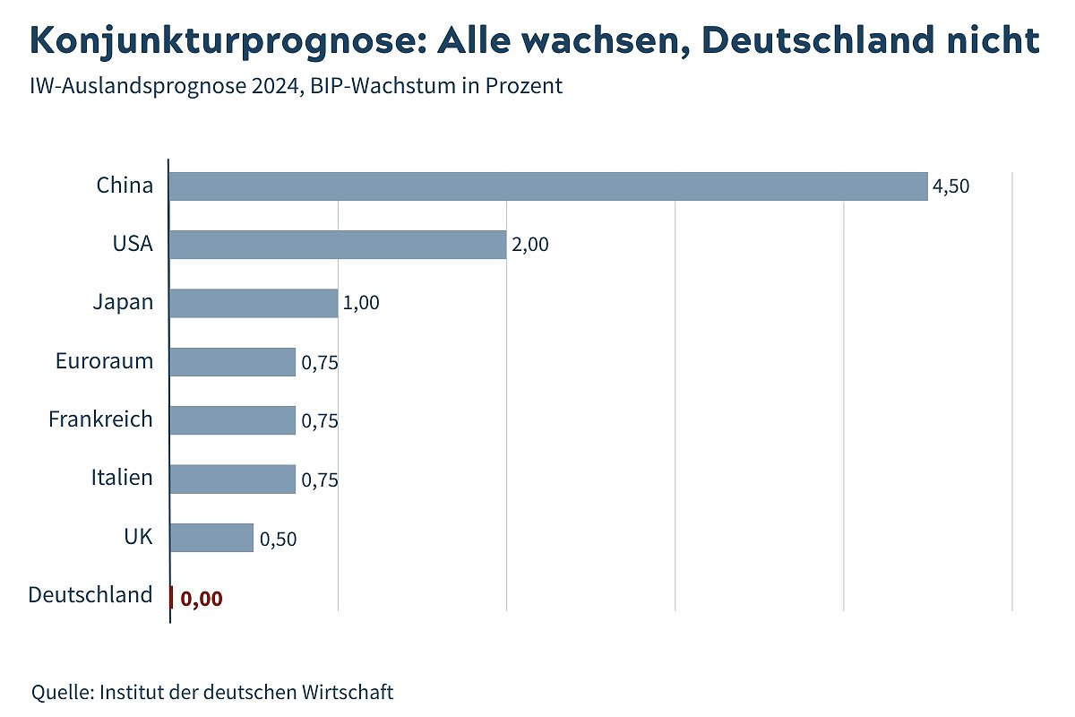 Frankreich, Italien, Großbritannien, die USA, Japan und China: Sie alle können 2024 mit einem Wachstum ihrer Wirtschaft rechnen. In Deutschland lässt der Aufschwung hingegen auf sich warten, zeigt die neue IW-Konjunkturprognose.