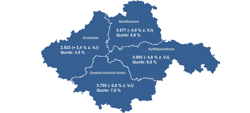 Der stärkste Rückgang der Arbeitslosigkeit zum Vorjahr war im Kyffhäuserkreis. Dort konnte die Zahl der Arbeitslosen zum Vorjahresmonat um 4,8 Prozent gesenkt werden. Auch in Nordhausen lag die Arbeitslosigkeit im März 4 Prozent niedriger als im Vorjahresmonat. Im Unstrut-Hainich-Kreis ist sie in etwa gleich hoch wie im vergangenen Jahr (- 0,5 Prozent). Das Eichsfeld verzeichnet einen Anstieg der Arbeitslosigkeit zum Vorjahr um 3,4 Prozent. Der Landkreis bleibt dennoch der mit der niedrigsten Arbeitslosenquote im Agenturbezirk. Im März 2025 betrug sie 4,5 Prozent.