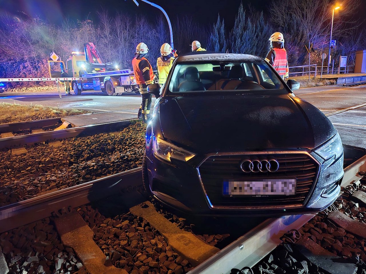 Bei Ankunft der Einsatzkräfte waren keine Personen mehr im Fahrzeug. Der Zugverkehr konnte rechtzeitig gestoppt werden. Die eingesetzten Feuerwehren sperrten den Bahnübergang und leuchteten die Unfallstelle aus. Das Fahrzeug musste durch ein Abschleppunternehmen aus dem Gleisbett geborgen werden.