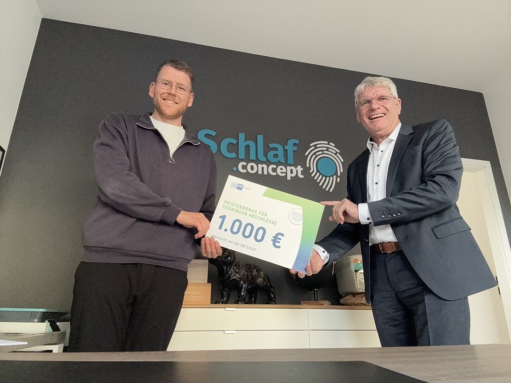 Florian Czischke ist einer der Absolventen der Höheren Berufsbildung, der sich im Dezember 2025 über die Auszahlung des Meisterbonus in Höhe von 1.000 Euro freuen konnte. Den symbolischen Scheck übergab Thomas Fahlbusch, Abteilungsleiter Aus- und Weiterbildung der IHK Erfurt. (Foto: IHK)