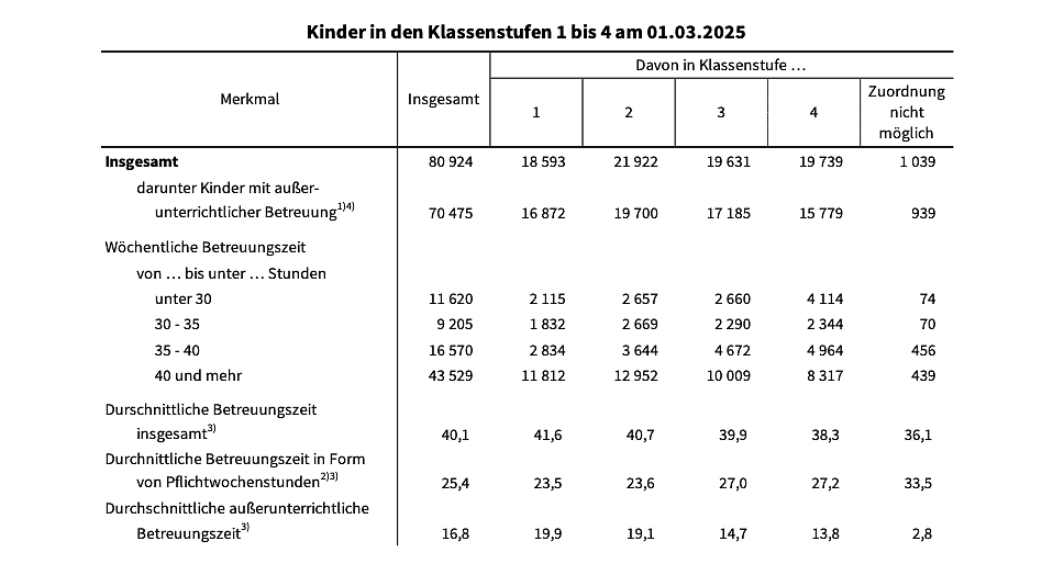 Nach Angaben des Thüringer Landesamtes für Statistik waren am 01.03.2025 von 80 924 Kindern im Grundschulbereich 70 475 Kinder bzw. 87,1 Prozent in außerunterrichtlicher Betreuung.