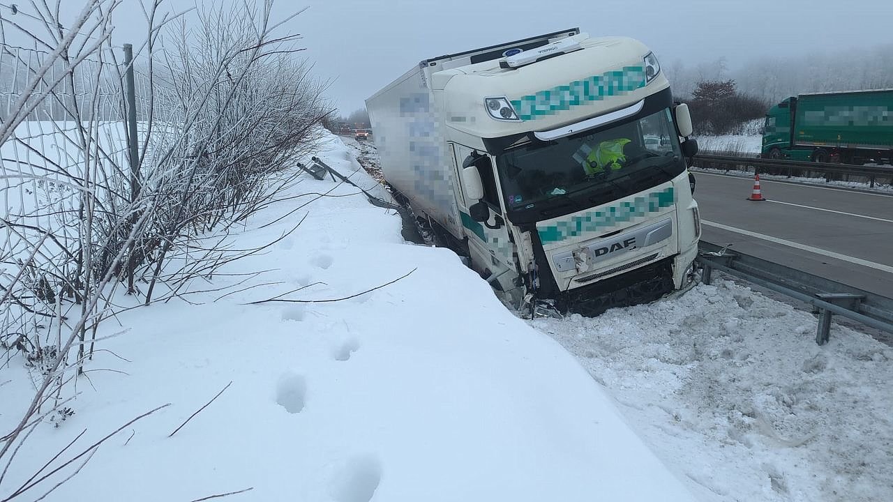 Nach eigenen Angaben verlor der Fahrer beim Bremsen aufgrund von Straßenglätte die Kontrolle über sein Fahrzeug. Der Lkw kam nach rechts von der Fahrbahn ab, rutschte in den Straßengraben und blieb schließlich rund 75 Meter später und hinter der Leitplanke stehen.