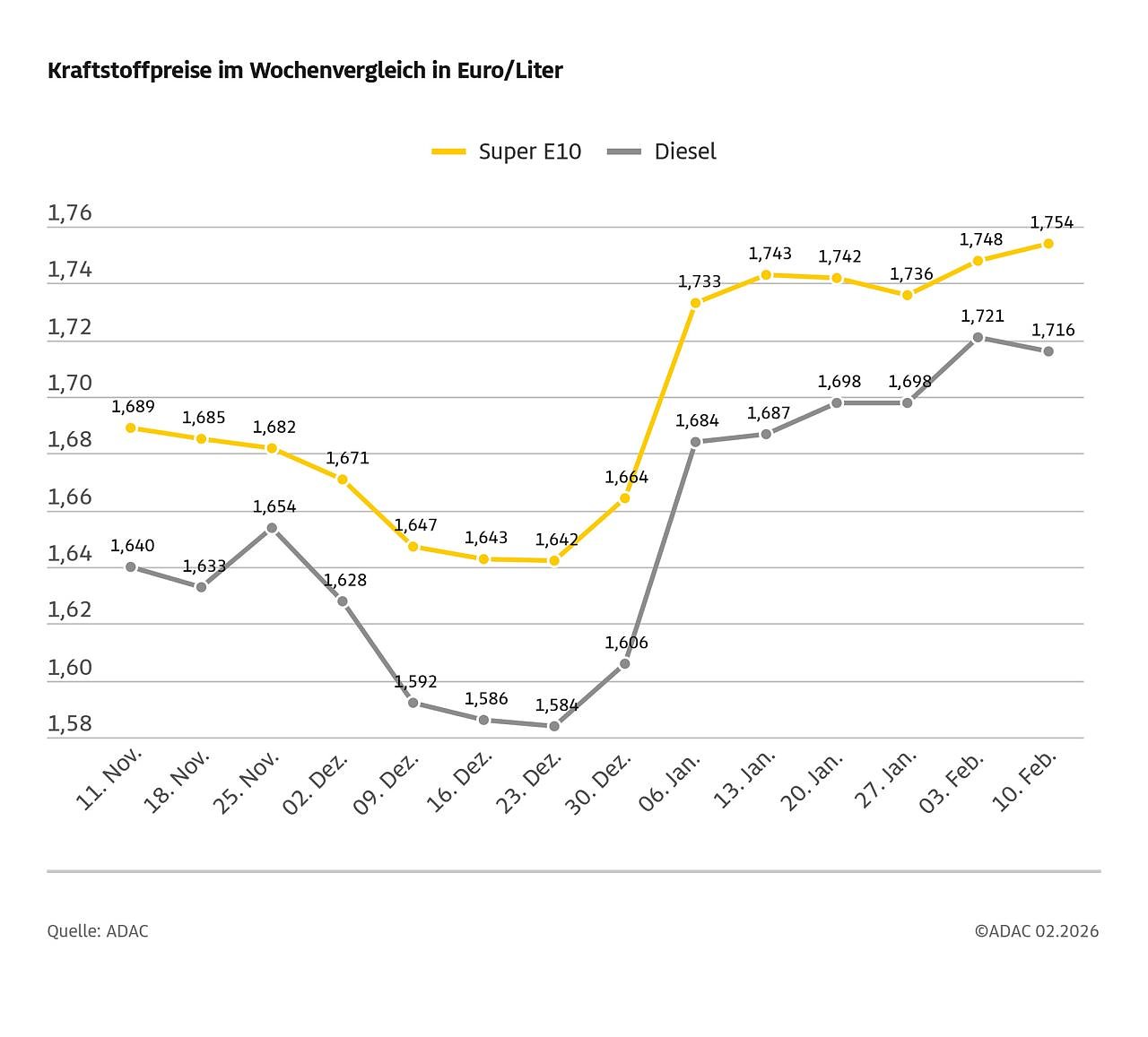 Laut aktueller ADAC Auswertung der Kraftstoffpreise kostet ein Liter Super E10 im bundesweiten Schnitt derzeit 1,754 Euro und damit 0,6 Cent mehr als in der Vorwoche. Die entgegengesetzte Richtung hat der Dieselpreis eingeschlagen, der um 0,5 Cent auf 1,716 Euro gesunken ist.