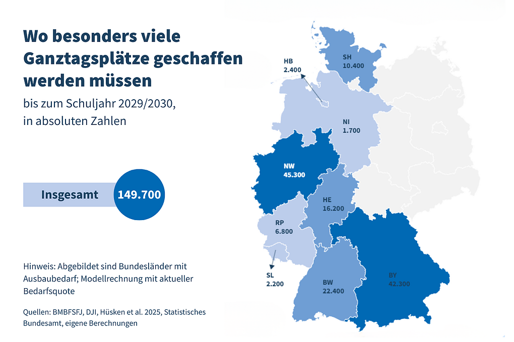 Besonders groß ist der Ausbaubedarf in Nordrhein-Westfalen mit 45.300 fehlenden Plätzen und in Bayern mit 42.300. Legt man eine Zielquote von 75 Prozent ganztags betreuter Grundschulkinder zugrunde, wären sogar mehr als 570.000 zusätzliche Ganztagsplätze nötig – davon rund 204.000 in Bayern,126.000 in NRW und 105.000 in Baden-Württemberg.