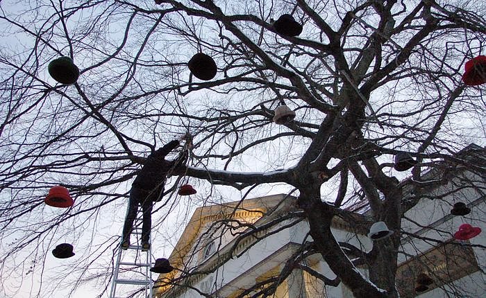Es sind Hüte, die Theaterliebhaber in den vergangenen Wochen an das Theater Nordhausen geschickt oder dort abgegeben haben. Die Hüte machen jetzt schon von weitem auf die neue Kammeroper aufmerksam, in der ein Hut eine gewisse Rolle spielt. Der Hut-Baum bietet jetzt im Winter einen besonders reizvollen Anblick. Einige besonders schöne Exemplare sind allerdings nicht an den Baum gewandert, sondern werden den Kopf mancher Sänger in künftigen Stücken, Opern oder Operetten bedecken – sie bereichern nun den Kostümfundus.