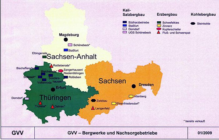 Die Standorte verteilen sich in Thüringen, Sachsen-Anhalt und Sachsen, also von Altenberg, Zwickau Gehren, Staßfurt bis zum Südharzrevier, um einige Orte zu nennen. Auf die Frage, warum nicht wie 1922 verfahren wurde, wo die Schächte nach fördernden, stillgelegten und in Reserve gehaltenen Schächten eingeteilt wurden, antwortete Hartwig: "Für die Schächte wären im Jahr 1,5 Millionen € notwendig gewesen, um die Wetterführung aufrecht zu erhalten und Instandhaltungsmaßnahmen durchzuführen. Das Geld aufzubringen war unter den Weltmarktpreisen für Kali zum damaligen Zeitpunkt nicht sinnvoll". Immerhin ist die GVV institutioneller Zuwendungsempfänger des Bundesfinanzministeriums. Zieht man Bilanz der GVV, so kann festgehalten werden, dass etwa 65 % des Flächenbestandes privatisiert und 10 % kommunalisiert wurden. Es wurden fast 5.800 neue Arbeitsplätze geschaffen und Investitionen von 360 Millionen Euro wurden ausgelöst. Die Privatisierungserlöse beliefen sich auf 95 Millionen Euro, so war es bei den Feierlichkeiten zum 15 jährigen Bestehens der GVV im Jahre 2008 zu vernehmen.
