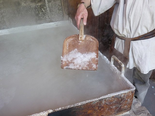 Beim Ziehen mit der Schippe gewinnt der Salzsieder das in früheren Zeiten sehr kostbare Salz. Bei warmen Temperaturen, wie hier zu Ostern, kann einem neben der heißen Siedepfanne ganz schön warm werden. Natürlich durfte kn auch mal von dem frisch gewonnenen Salz kosten. Dabei viel doch auf, dass eben Salz nicht gleich Salz ist, wie man so landläufig denkt. Irgendwie war es im Geschmack anschließend etwas milder.