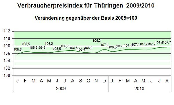 Der Verbraucherpreisindex erhöhte sich im Monat August gegenüber dem Vormonat Juli um 0,1 Prozent. Er erreichte einen Indexstand von 107,7 Prozent (Basis 2005=100). Die Jahresteuerungsrate blieb nach Mitteilung des Thüringer Landesamtes für Statistik mit 0,8 Prozent unverändert.