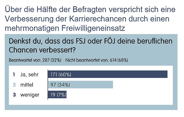 Die meisten Befragten machen positive Erfahrungen im Rahmen ihrer freiwilligen Tätigkeit: 68 Prozent sind sehr zufrieden, 72 Prozent wollen sich beispielsweise nach ihrem FSJ weiterhin engagieren und 94 Prozent empfehlen auch anderen, sich zu engagieren.