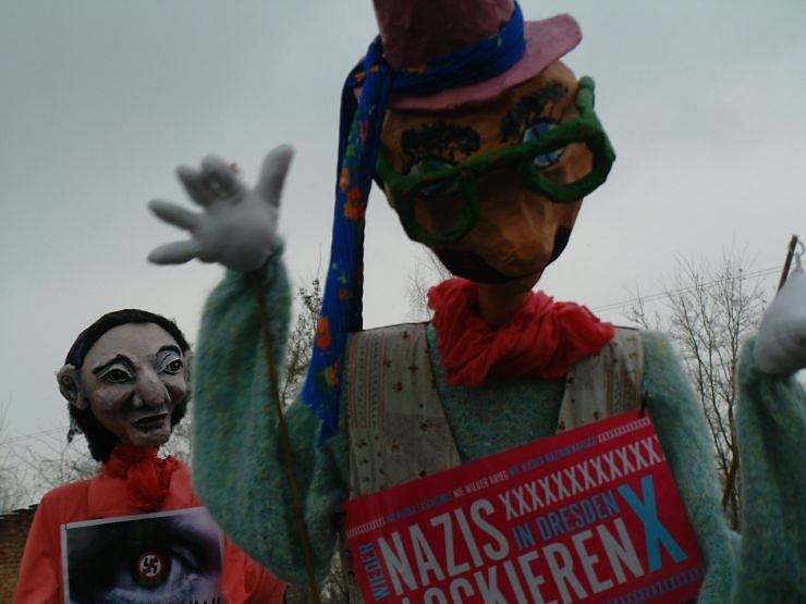 In Richtung Bahnhof sowie im Süden und an der angrenzenden Unterführung im Norden hat die Polizei Stellung bezogen. Seit dem frühen Mittag harren die Menschen hier aus und weigern sich den Platz zu räumen. Auch der Jenaer Oberbürgermeister, Albrecht Schröter (SPD), einer der bekanntesten Gegner der extremen Rechten, befindet sich auf der Blockade. Neun Busse sind allein aus seiner Stadt angereist. Tags zuvor hatte er gegenüber der Online Ausgabe des Spiegel erklärt: „Straßenblockaden gegen Neonazis mögen nicht legal sein, aber sie sind legitim. Es ist ein Dilemma, dass die Mittel des Rechtsstaats gegen rechte Aufmärsche begrenzt sind. Aber Politiker und Bürger sollten alles tun, um den Neonazis keinen Raum zu geben. Dazu gehört auch ziviler Ungehorsam.“