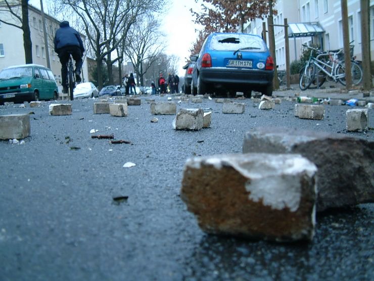 "In der Südvorstadt ändert sich das Bild der Demonstrationen. Eine nahe gelegene Großbaustelle wurde geplündert und Bauzäune und Holzstangen versperren die Straße für Fahrzeuge. Zusammen mit einem stetigen Strom von Menschen ziehen wir an mehreren brennenden Mülltonnen vorbei in Richtung Bahnhof, derweil schwarz vermummte weiterhin an den Barrikaden basteln und Material auf die Straße zerren."